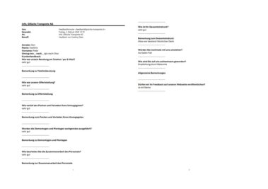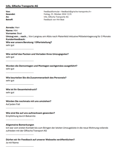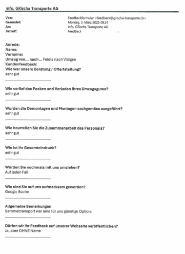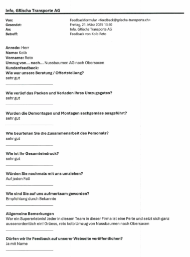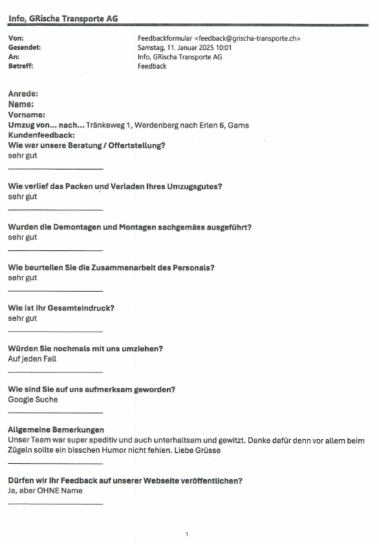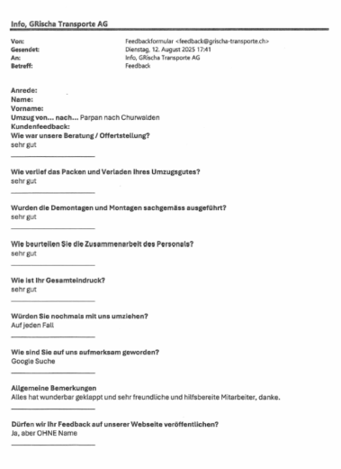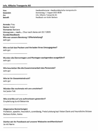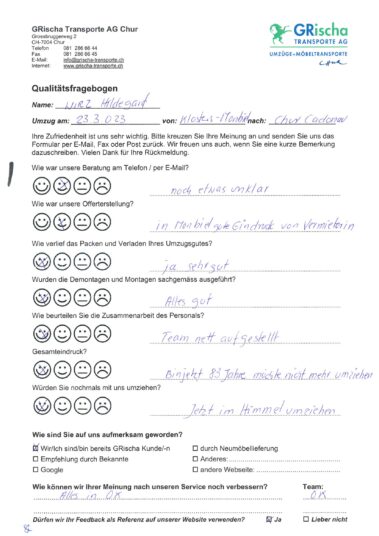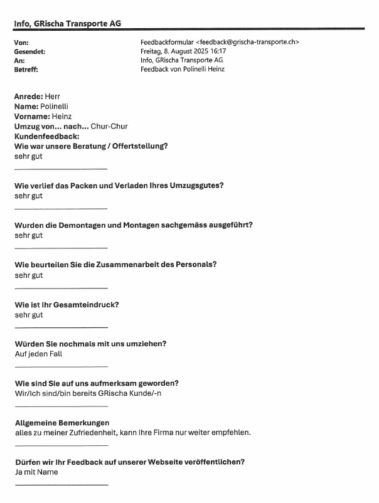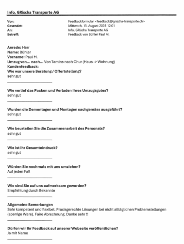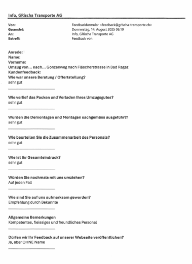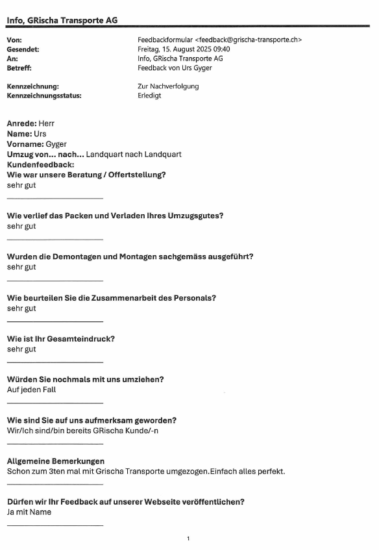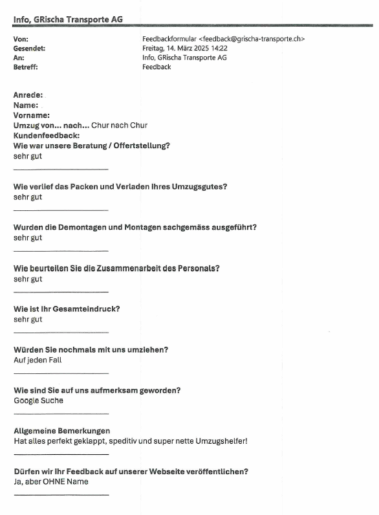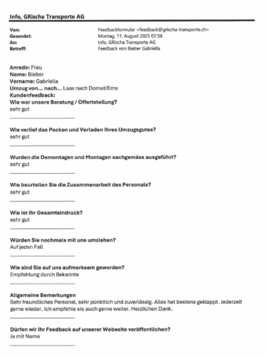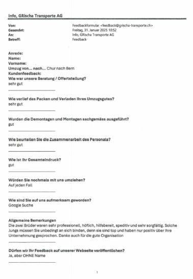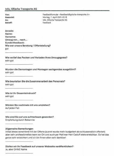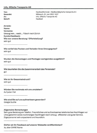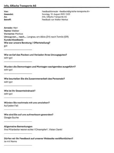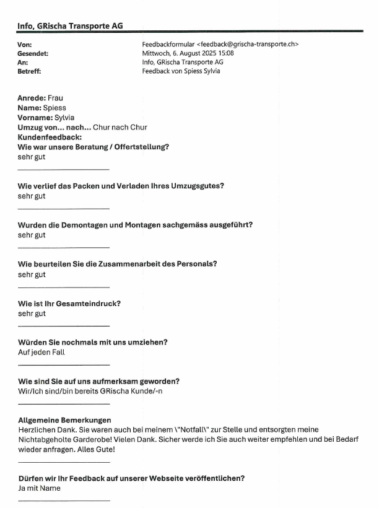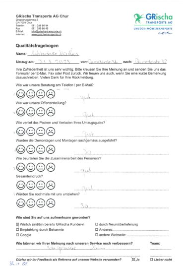 Wir bitten alle unsere Kunden um ein ehrliches Feedback zu unserer Arbeit. Nur so können wir unsere Dienstleistungen stetig verbessern und unser Angebot den Kundenvorstellungen anpassen. Lesen Sie hier die aktuellsten Feedbacks unserer Kundschaft.