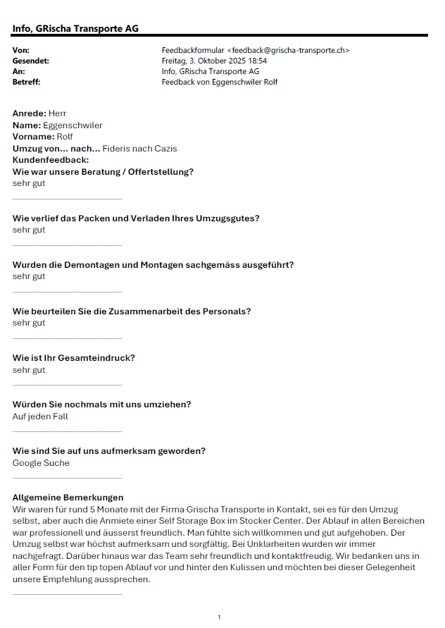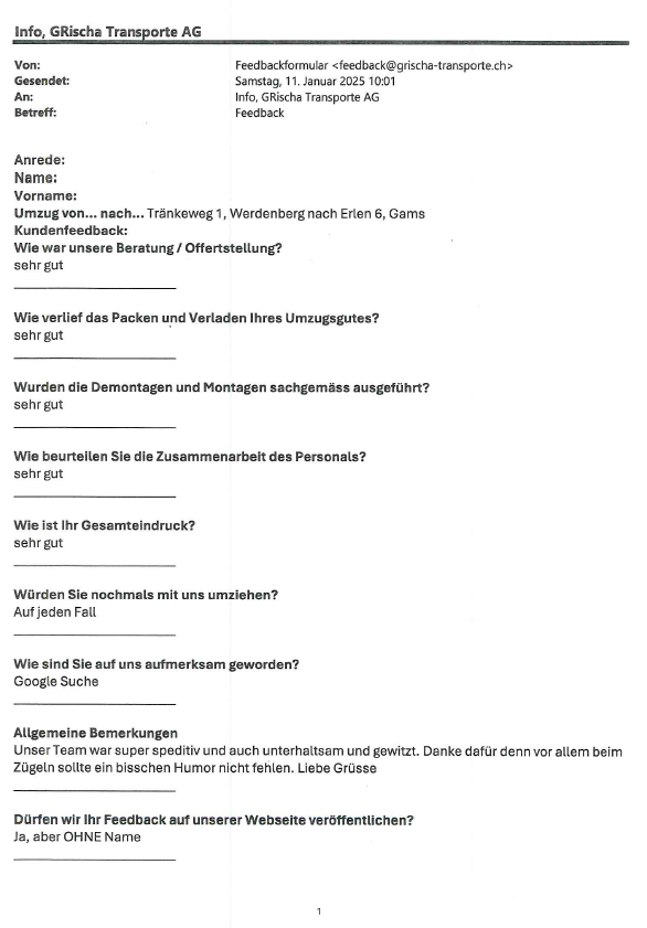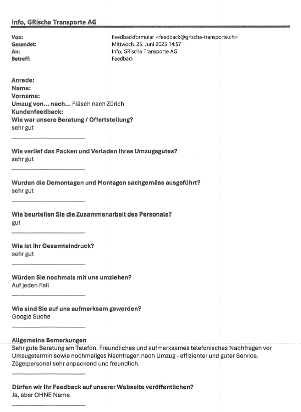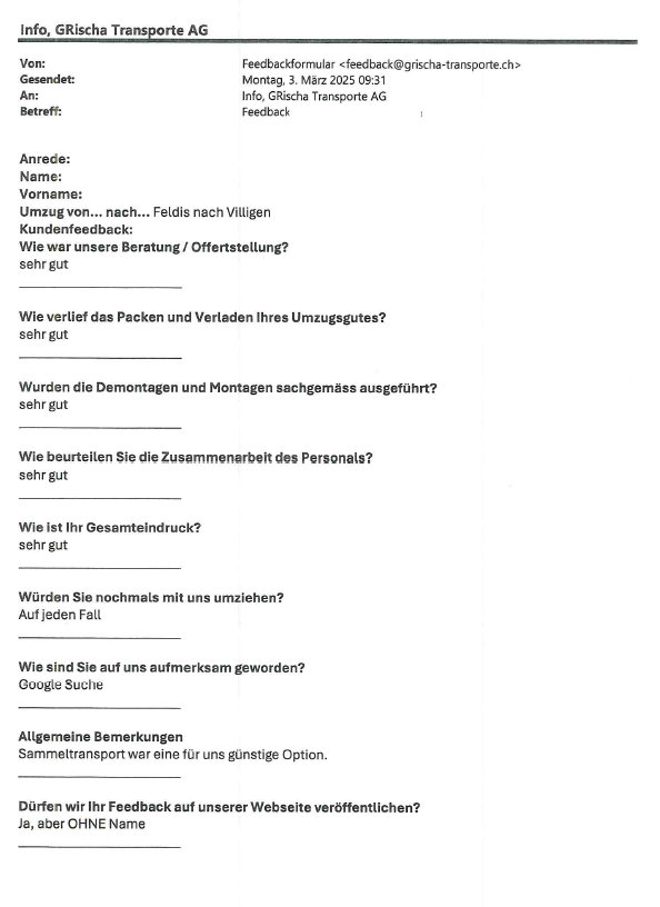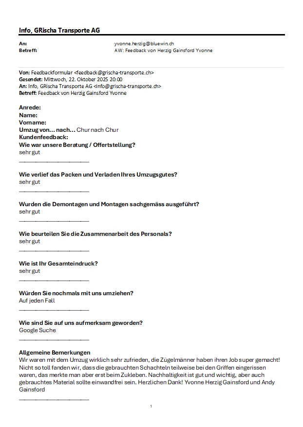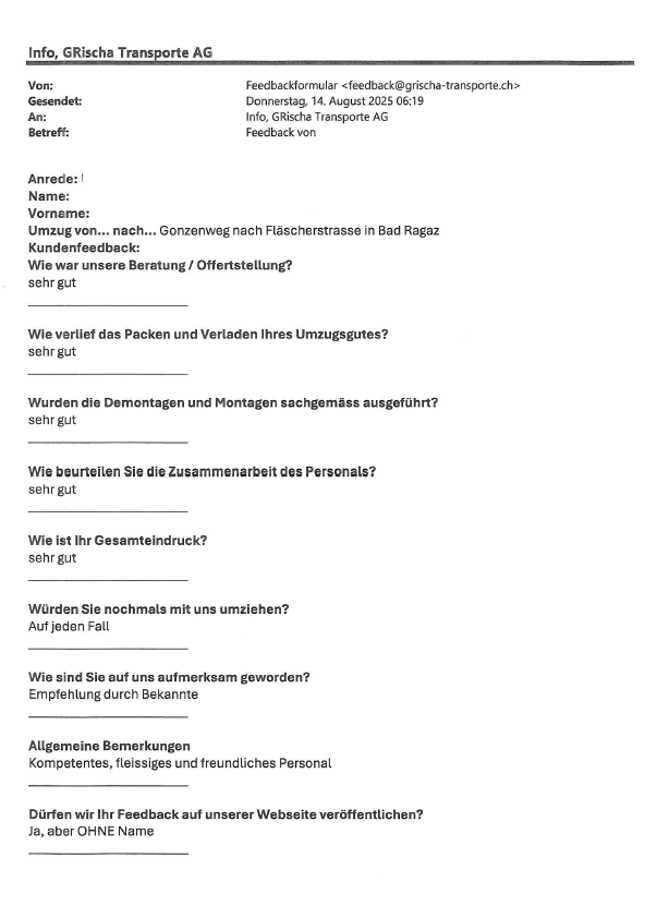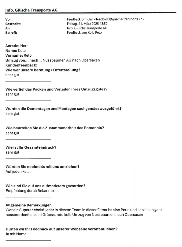 Wir bitten alle unsere Kunden um ein ehrliches Feedback zu unserer Arbeit. Nur so können wir unsere Dienstleistungen stetig verbessern und unser Angebot den Kundenvorstellungen anpassen. Lesen Sie hier die aktuellsten Feedbacks unserer Kundschaft.